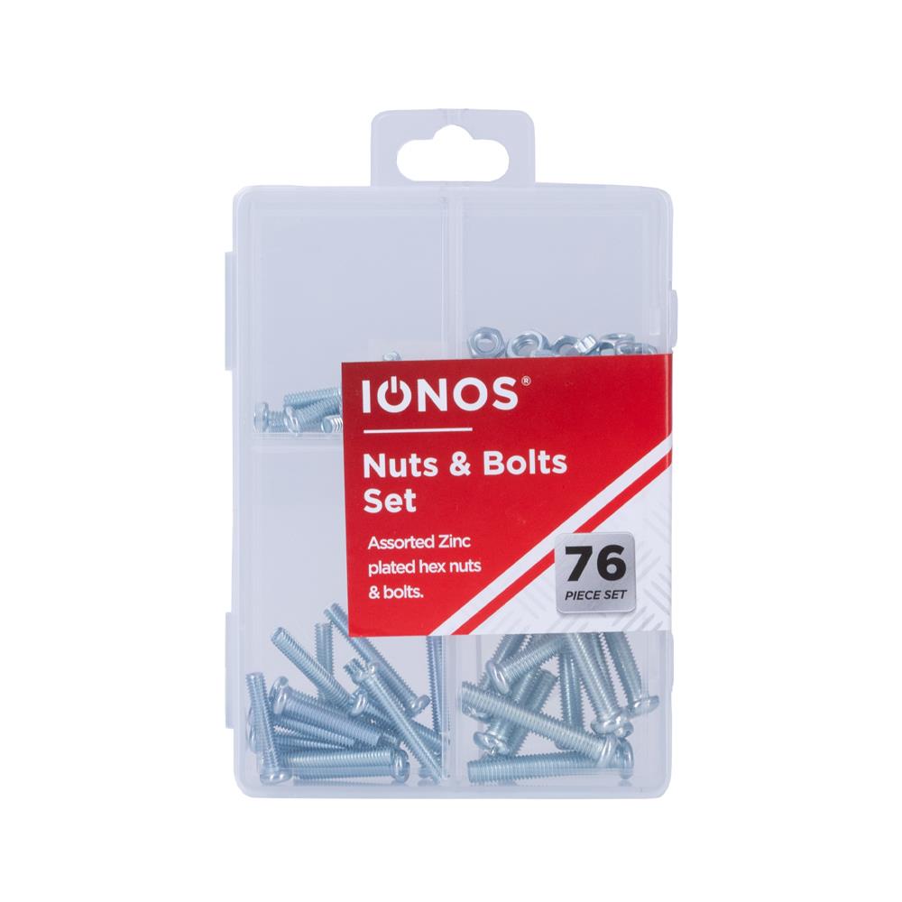 - IONOS Zinc Plated Nuts & Bolts Set 76 Piece Set IONOS Zinc Plated Nuts & Bolts Set 76 Piece Set